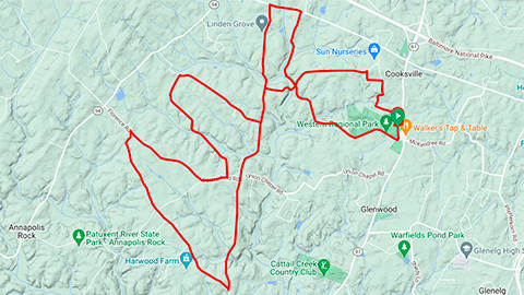 Join us Wednesday, March 25, at 5:30 p.m., for our midweek ride! Choose from two routes in western Howard County: 17 miles and 21 miles. The ride leaves from the Gary J. Arthur Community Center, in Glenwood, Md. Use the links at right for GPS files, cue sheets, and Ride with GPS pages. Please pre-register here: